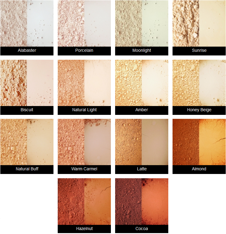 Alabaster, Moonlight, Porcelain, Sunrise, Biscuit, Natural Light, Natural Buff, Honey Beige, Warm Caramel :